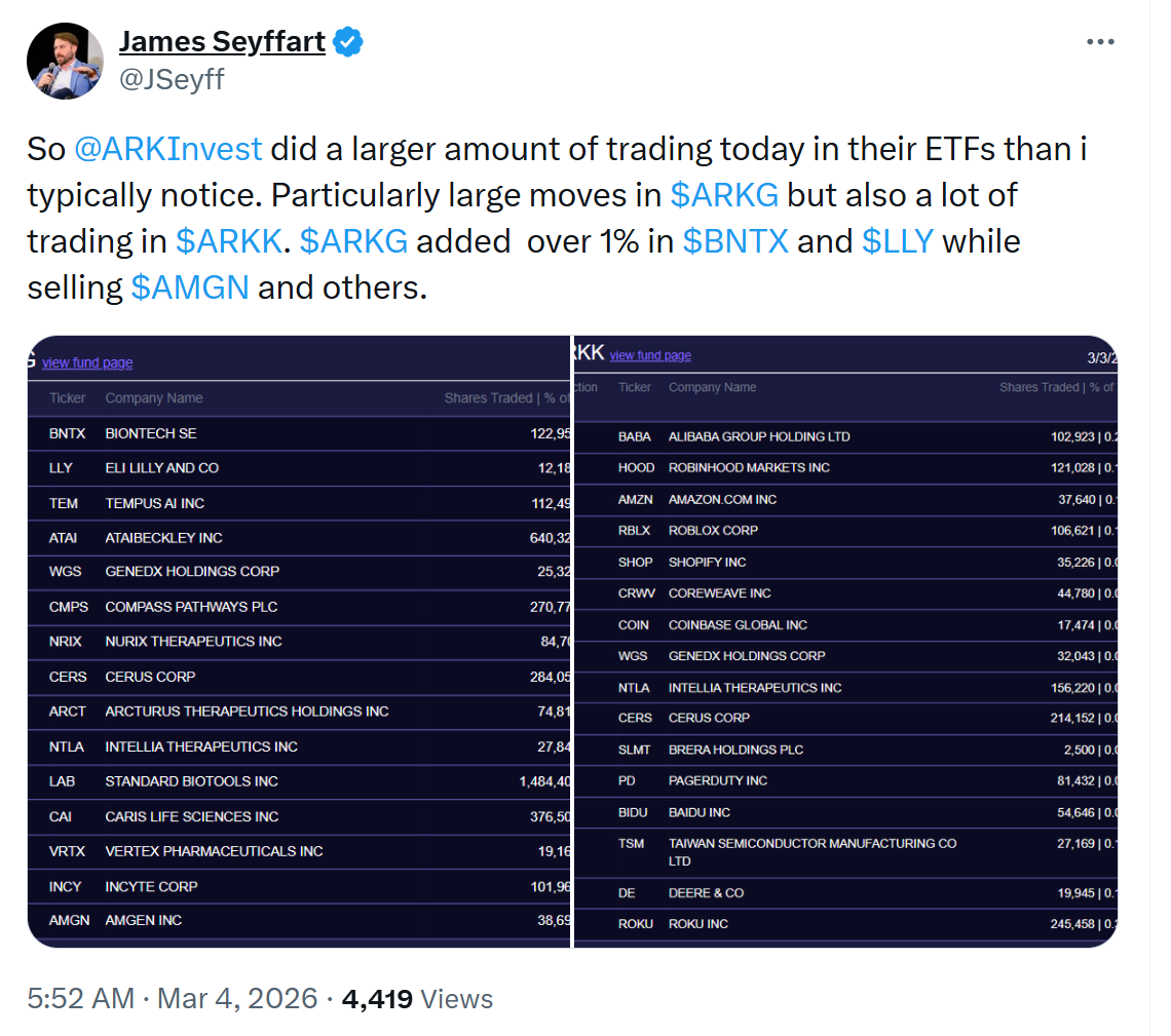 ABD-İran gerilimi piyasaları baskılarken, Coinbase hisseleri yüzde 1,55, Robinhood yüzde 3,44 değer kaybetti. Ark, portföyünü yeniden yapılandırarak Roblox, Shopify, Amazon gibi şirketlere ekleme yaparken Roku, Baidu gibi pozisyonları azalttı. ETF analisti James Seyffart, Ark’ın gün içinde olağandışı yüksek hacimli işlem yaptığını belirtti. Geçen ay Coinbase alımları sonrası Coinbase, 2025 dördüncü çeyrekte 667 milyon dolar net zarar açıkladı; net gelir yüzde 21,5 düşerek 1,78 milyar dolara geriledi.