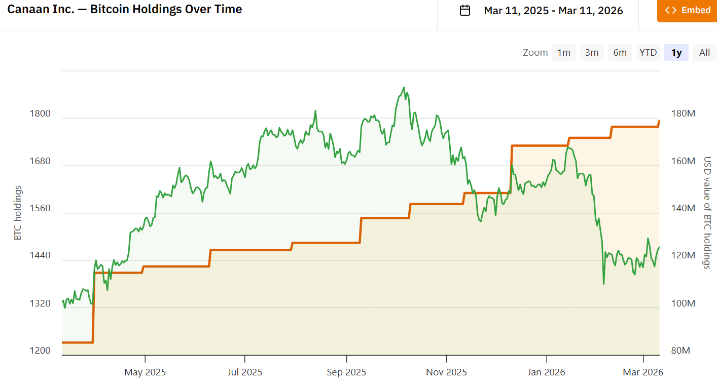 Canaan’s Bitcoin holdings keep rising. Source: BitcoinTreasuries.NET